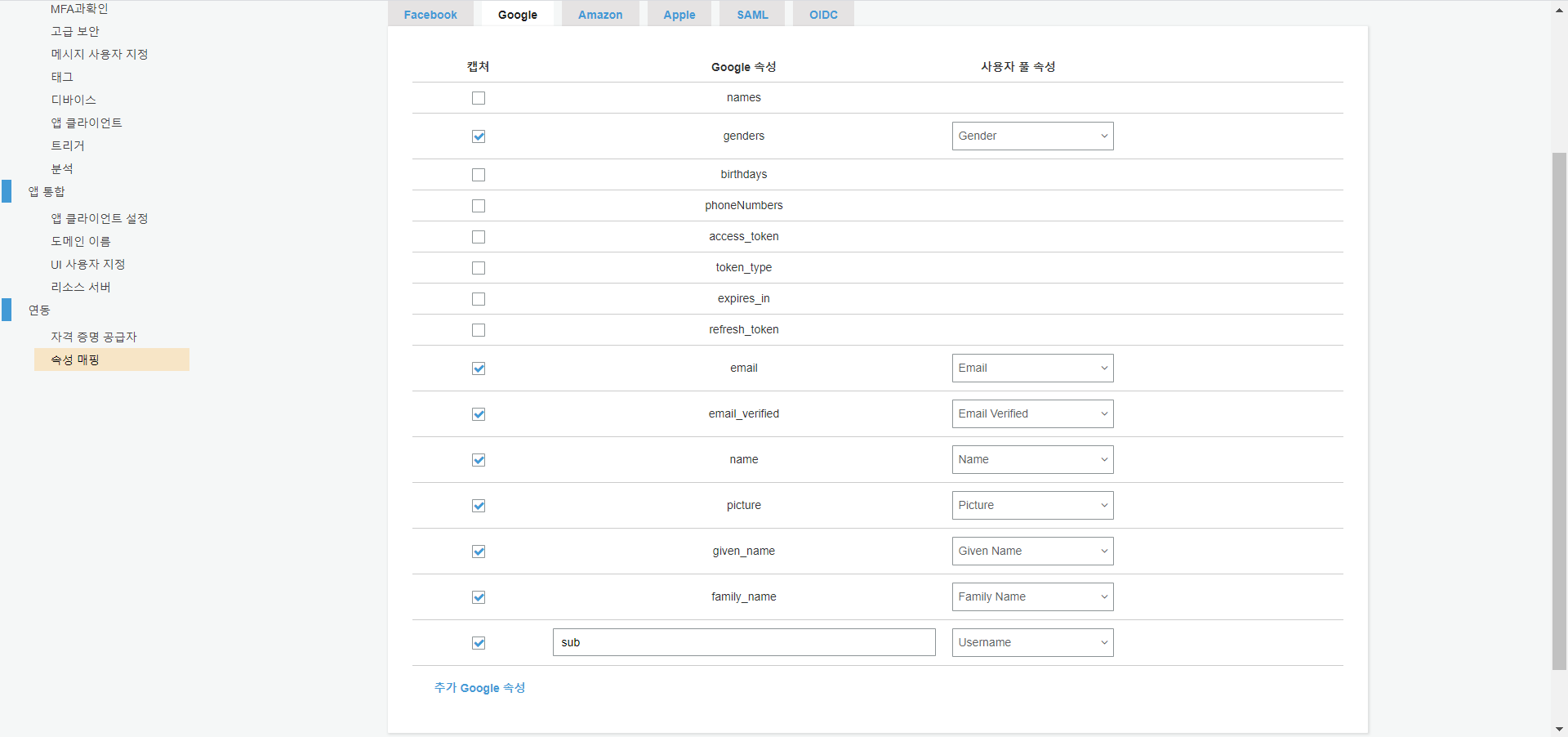 구글 사용자의 속성 이름과 Cognito 사용자의 속성 이름은 다릅니다. 이름이 우연히 같다고 해도 Cognito는 인식하지 못하기 때문에 직접 매핑해 주어야 합니다.
