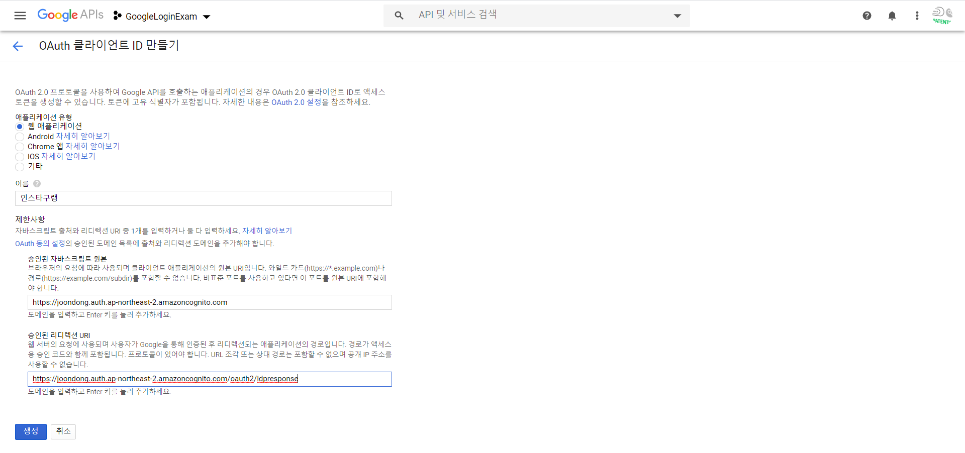 사용자 인증정보 만들기 > OAuth 클라이언트 ID