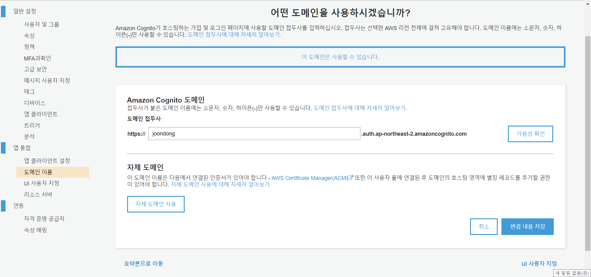 앱 통합 > 도메인 이름에서 원하는 도메인(joondong 부분)을 입력후 가용성 확인 버튼을 클릭해 줍니다.