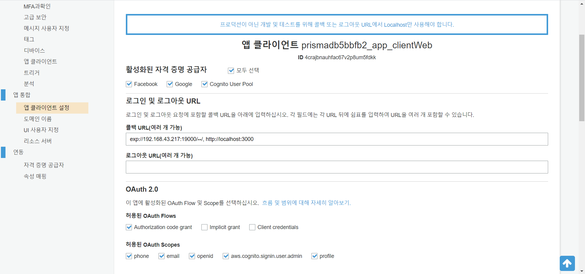 3. Cognito에 Oauth 클라이언트 ID 정보 입력