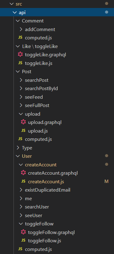 src/api 폴더에 카테고리 및 API별로 폴더를 만들어서 각 폴더에 graphql 파일(타입 및 Resolver 정의)과 js 파일(Resolver 구현)을 짝지어 위치시켰습니다.