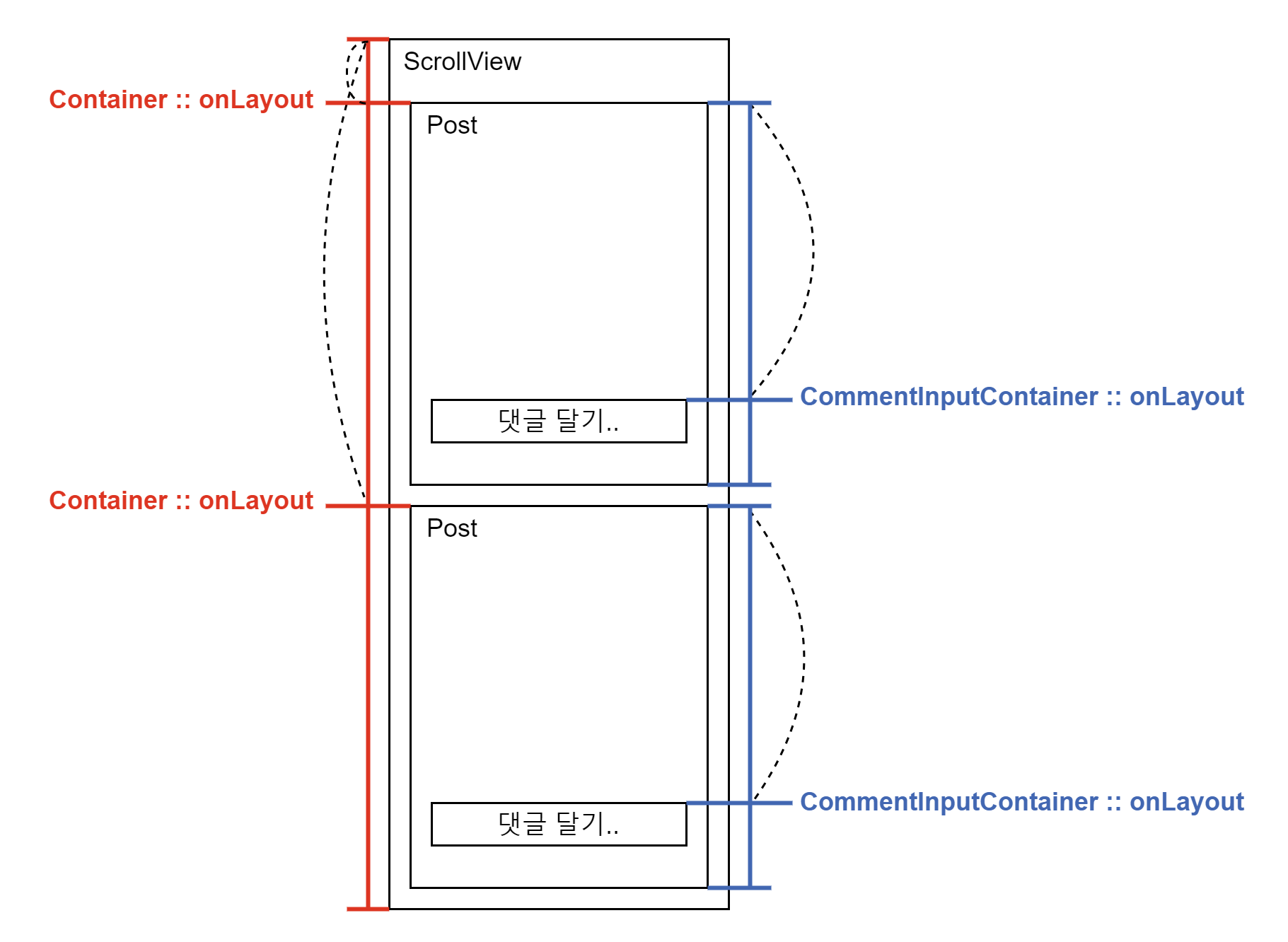 Container::onLayout에서 얻은 layout.y를 저장할 yPosition과 CommentInputContainer::onLayout에서 얻은 layout.y를 저장할 yOffset 필드를 정의했고, PostPresenterInside 컴포넌트에서 yPosition과 yOffset의 값을 변경할 수 있도록 setY 함수와 setOffset 함수를 만들어서 PostPresenterInside 컴포넌트에 전달했습니다.