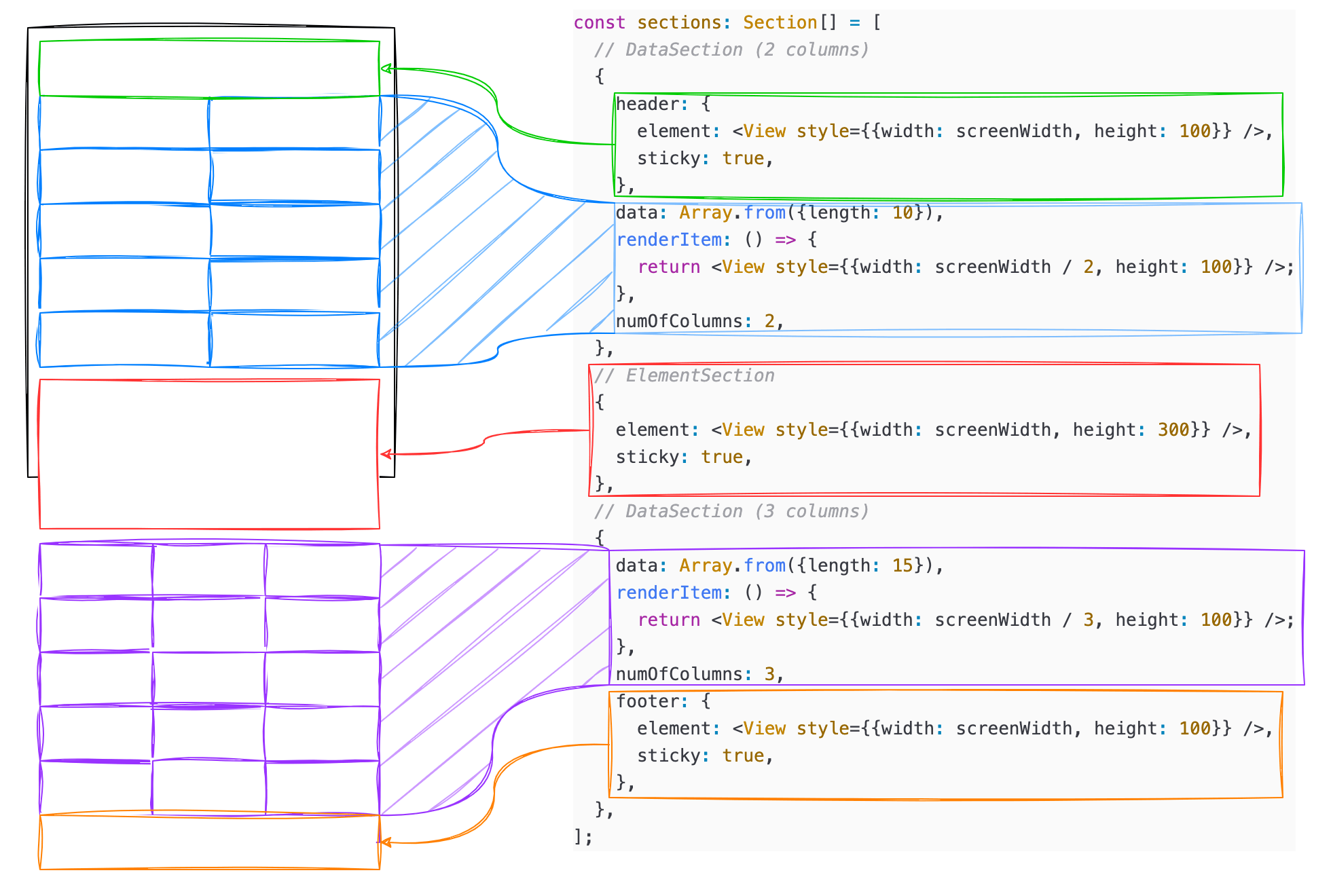 각 Section마다 data와 renderItem, numOfColumns, sticky 속성을 설정하여, 섹션별로 서로 다른 레이아웃을 구성할 수 있습니다.