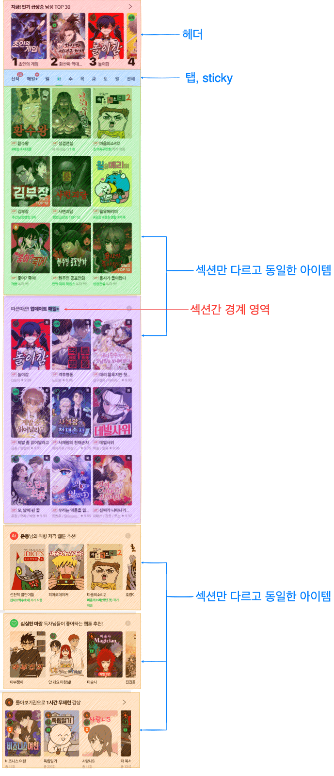 FlashList를 사용하여 섹션간 아이템을 재사용하고 싶은데, 단일 FlashList만 사용하여 네이버 웹툰같은 레이아웃을 그리기엔 코드가 좀 장황해 집니다.