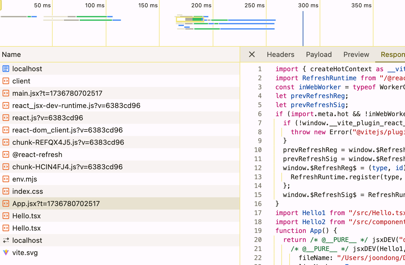 그리고 브라우저는 ES 모듈 중에 Hello 컴포넌트가 없다면 개발 서버에 요청하면서 순차적으로 모듈을 받아옵니다.